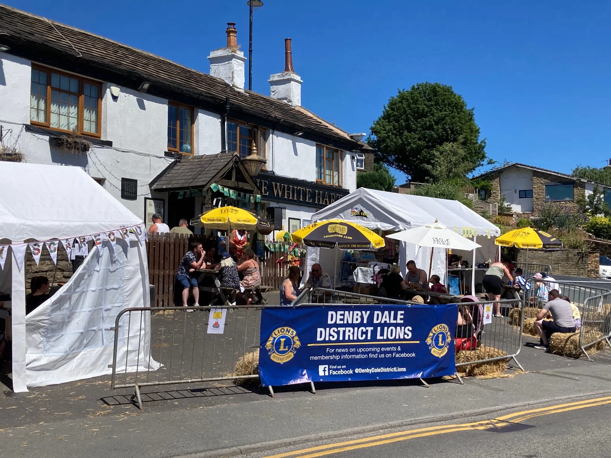 Outdoor community event organized by Denby Dale District Lions with tents, umbrellas, and hay bales, in front of a pub called The White Hart, on a sunny day with people socializing.