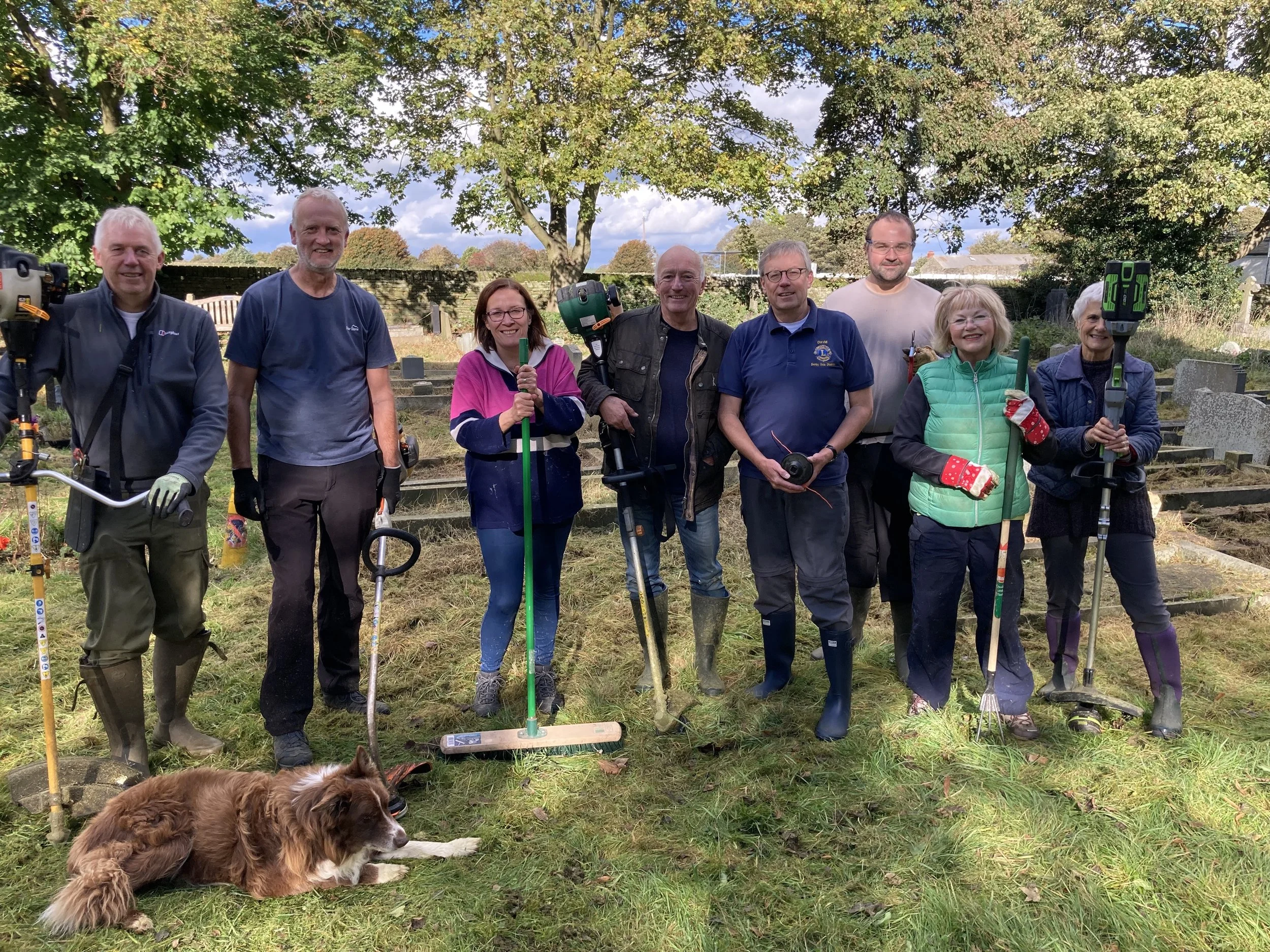 Group of nine people standing outdoors in a grassy area with trees, holding gardening tools and wearing gloves and boots. There is a brown and white dog lying on the ground in front of them.