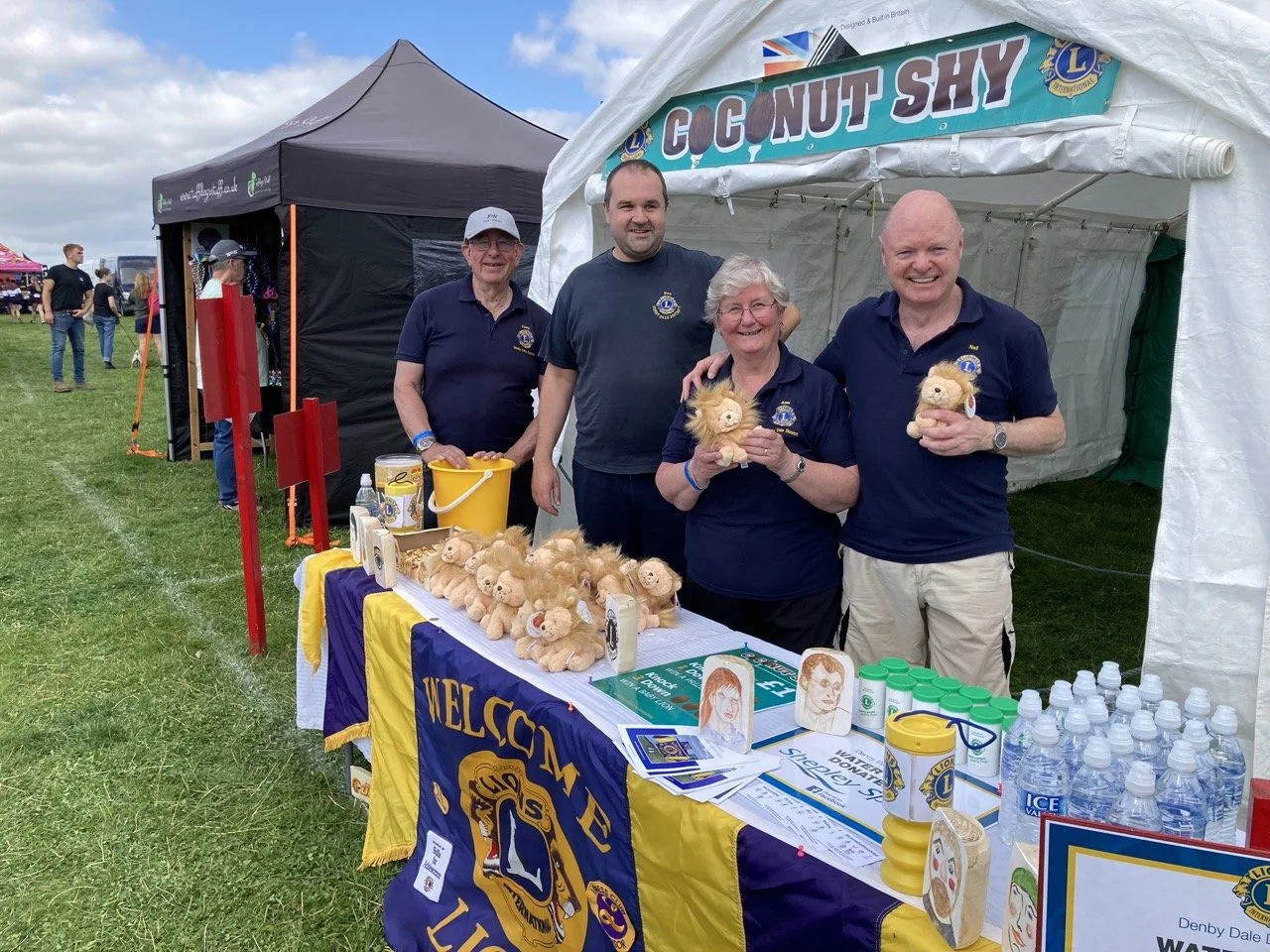 A group of four people standing behind a Lions Club booth at an outdoor event. They are smiling and holding Lion plush toys. The booth has a Lions banner and various lion-themed items on a table, with water bottles and pamphlets. The background has tents and other event attendees on a grassy field.