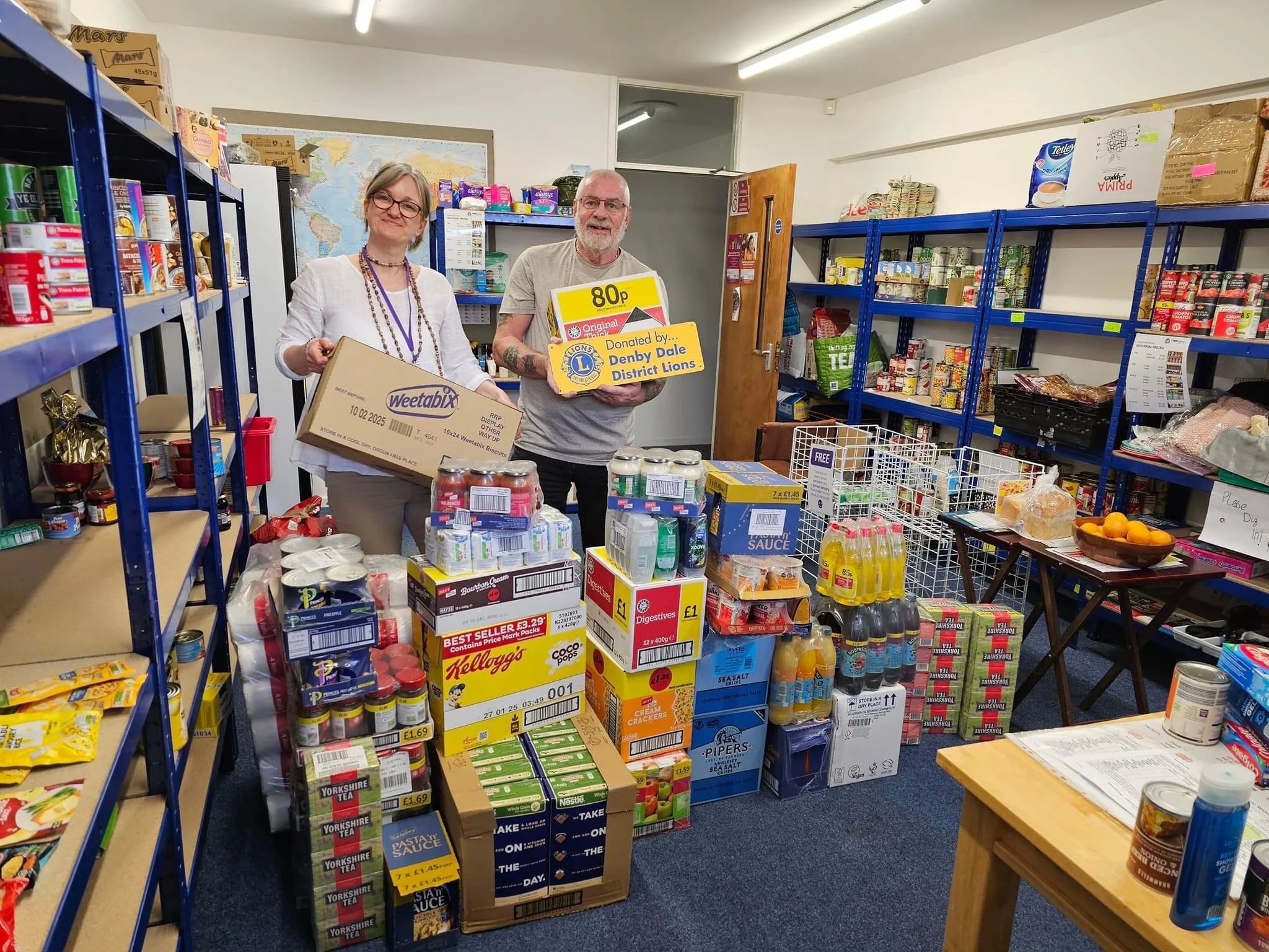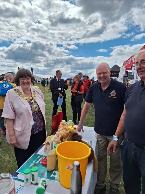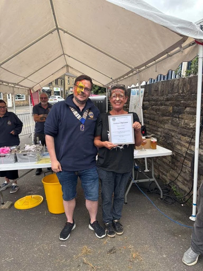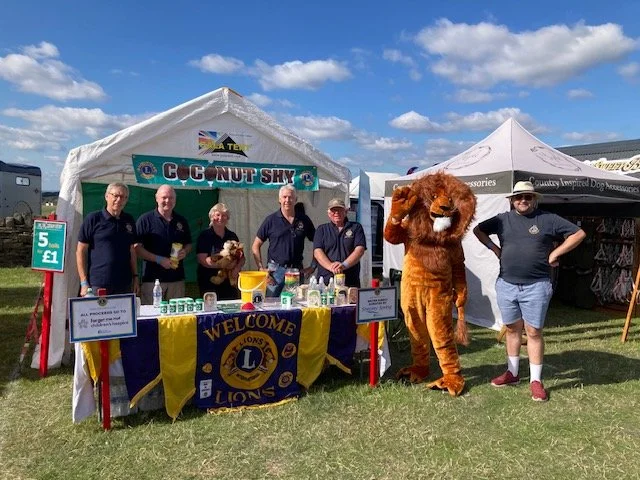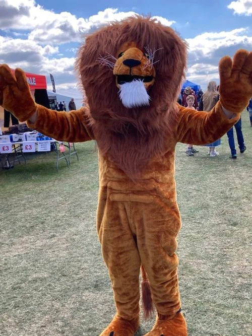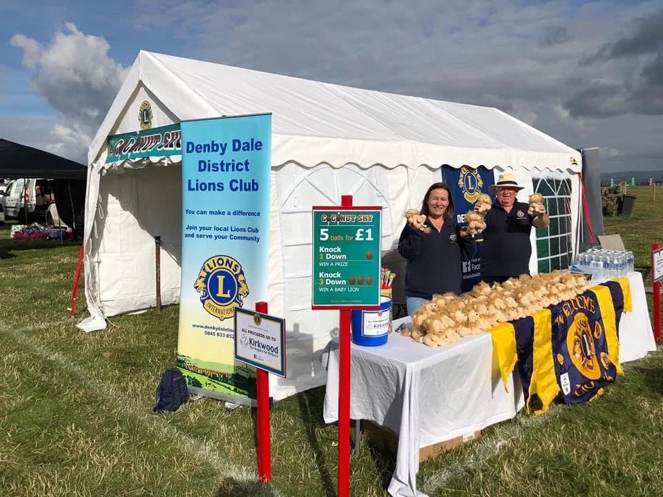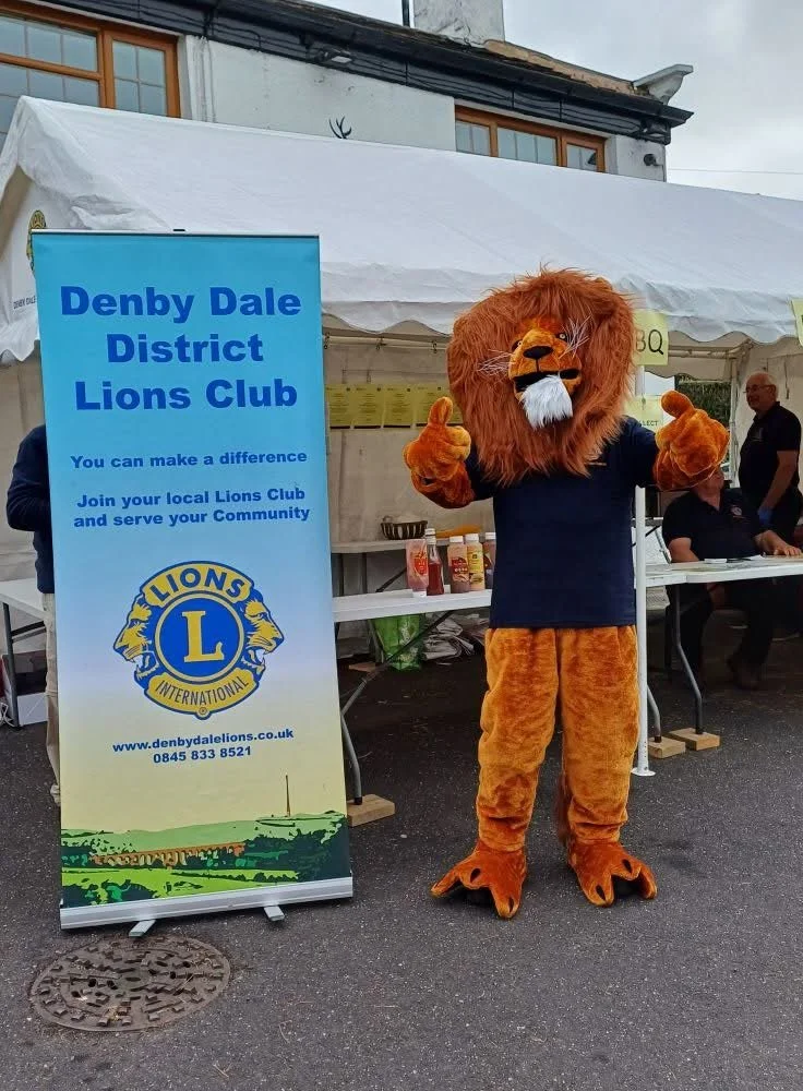 Person in a lion costume giving thumbs up at a Lions Club booth, next to a blue sign that reads 'Denby Dale District Lions Club' with the Lions Club logo and contact information.