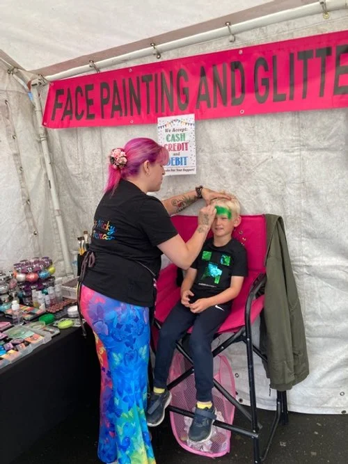 A young girl gets her face painted by a woman at a face painting booth inside a tent, with a pink banner that reads 'FACE PAINTING AND GLITTER' above them.