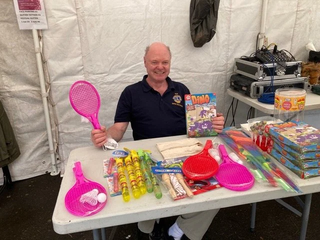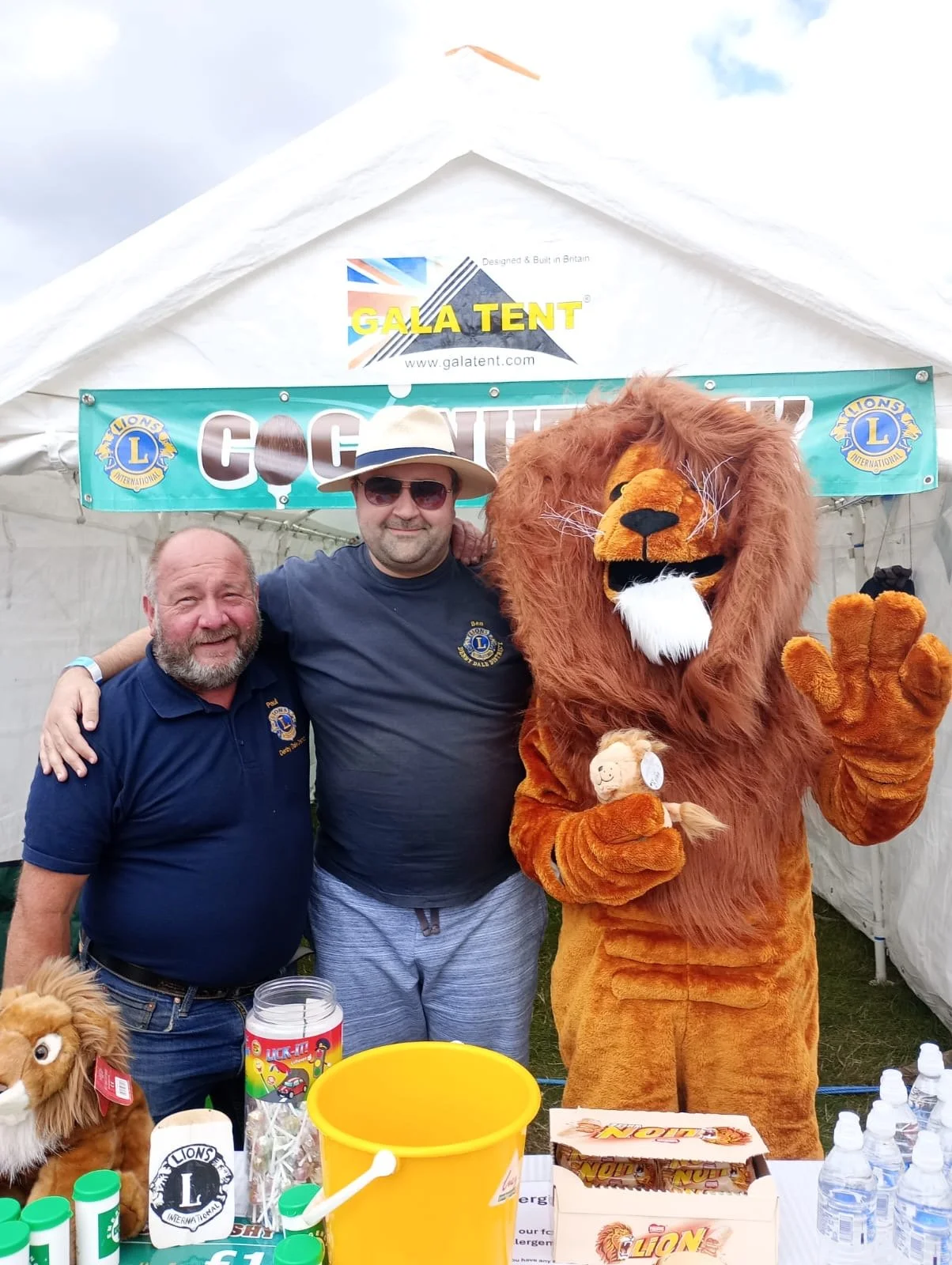 Two men and a person in a lion costume pose together at a Lions Club event, standing in front of a tent with a banner, with various items like toys, water bottles, and containers on the table in front of them.