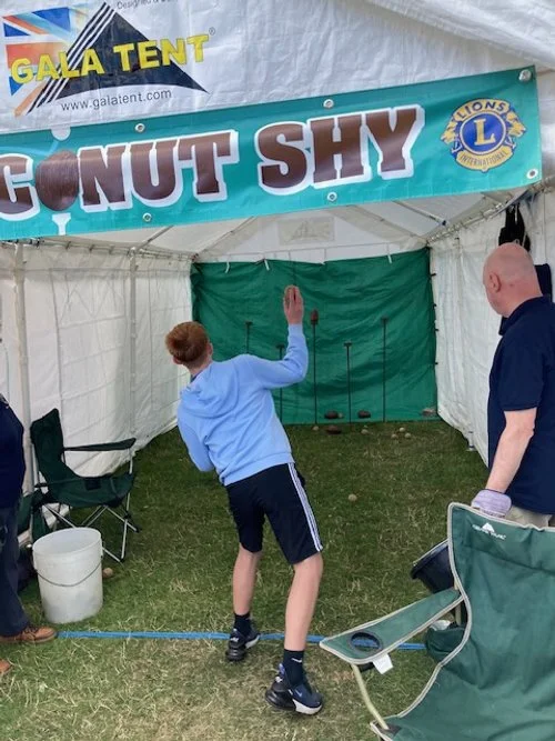A young boy playing a shygame at an outdoor event under a tent. The tent has a banner that reads 'COCONUT SHY' with a Lions Club logo. The boy is about to throw a beanbag at a green backdrop with three holes.