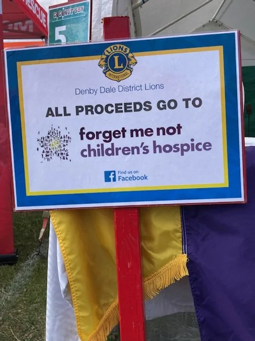Sign for Denby Dale District Lions stating all proceeds go to 'forget me not children's hospice' with a Facebook logo underneath.