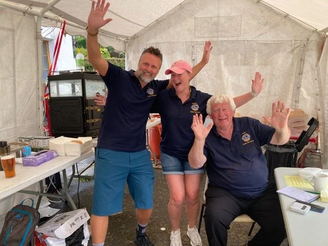 Three smiling people in navy shirts waving, inside a tent with a table and drinks.