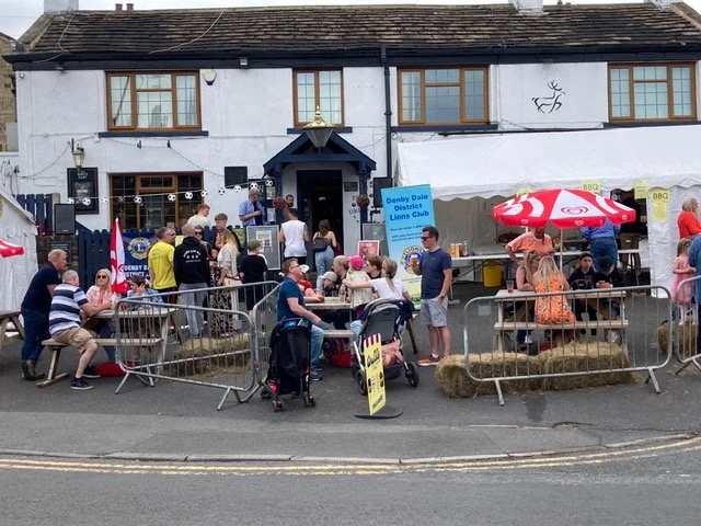 Street festival outdoors in front of a pub with people sitting at tables under yellow and white umbrellas, hay bales, and a blue banner that reads "Denby Dale District Lions".