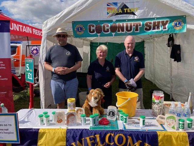 Group of people at a Lions Club booth on a grassy field, with a lion mascot costume, tents, and a sign for coconut shy game.