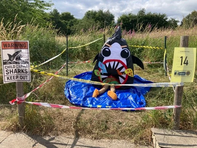 Sign for the Scarecrow Trail at Denby Dale District Lions, featuring a cartoon scarecrow with a blue jacket and a brown hat, with event details for the 9th and 10th.