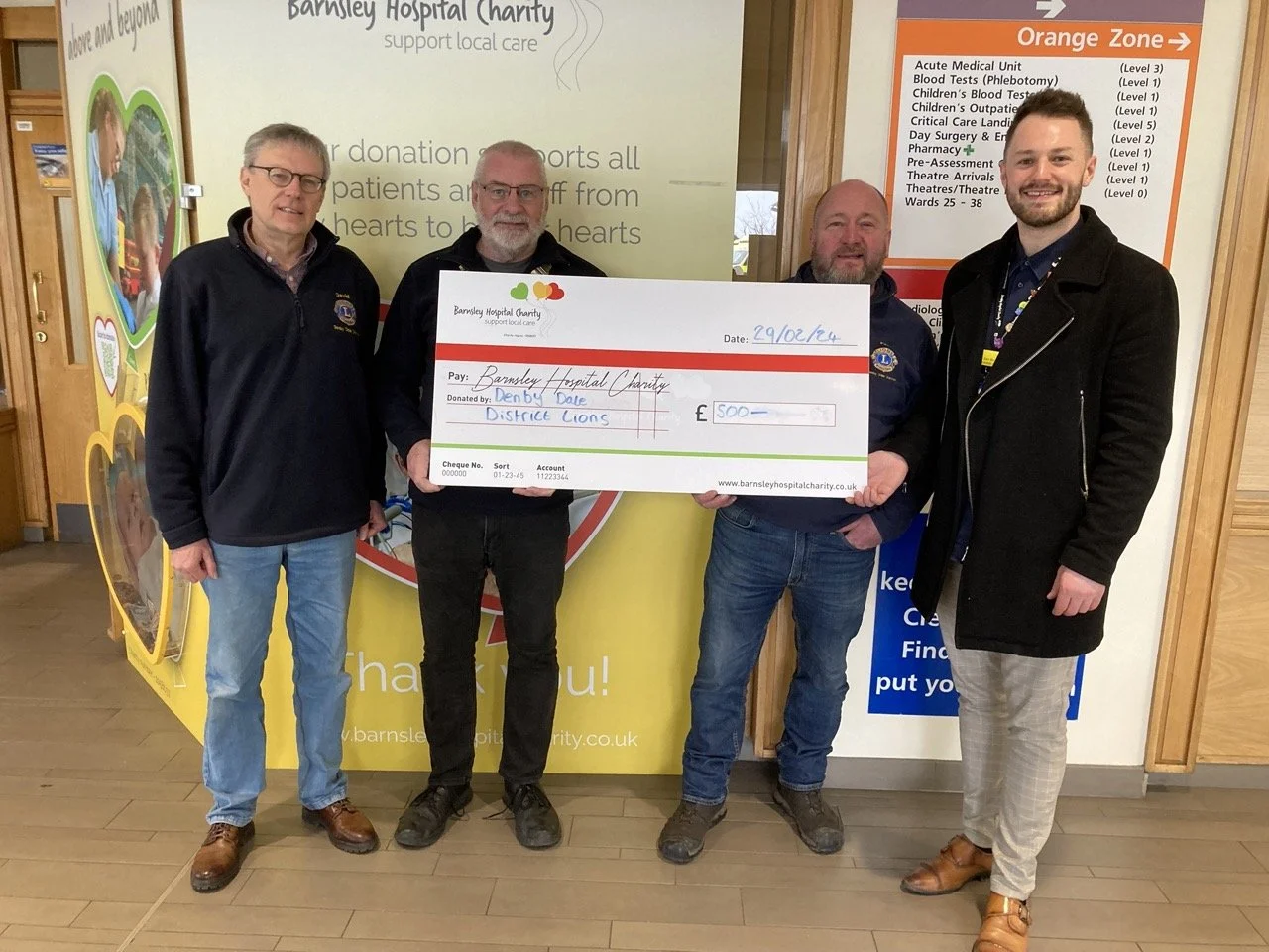 Four men standing inside a hospital, holding a large donation check made out to Barnsley Hospital Charity for 500 pounds. The background features colorful signage and a hospital directory.