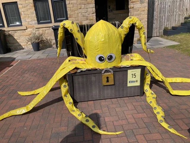 A large yellow octopus-shaped float or decoration with googly eyes, placed on top of a black outdoor storage box on a brick patio.