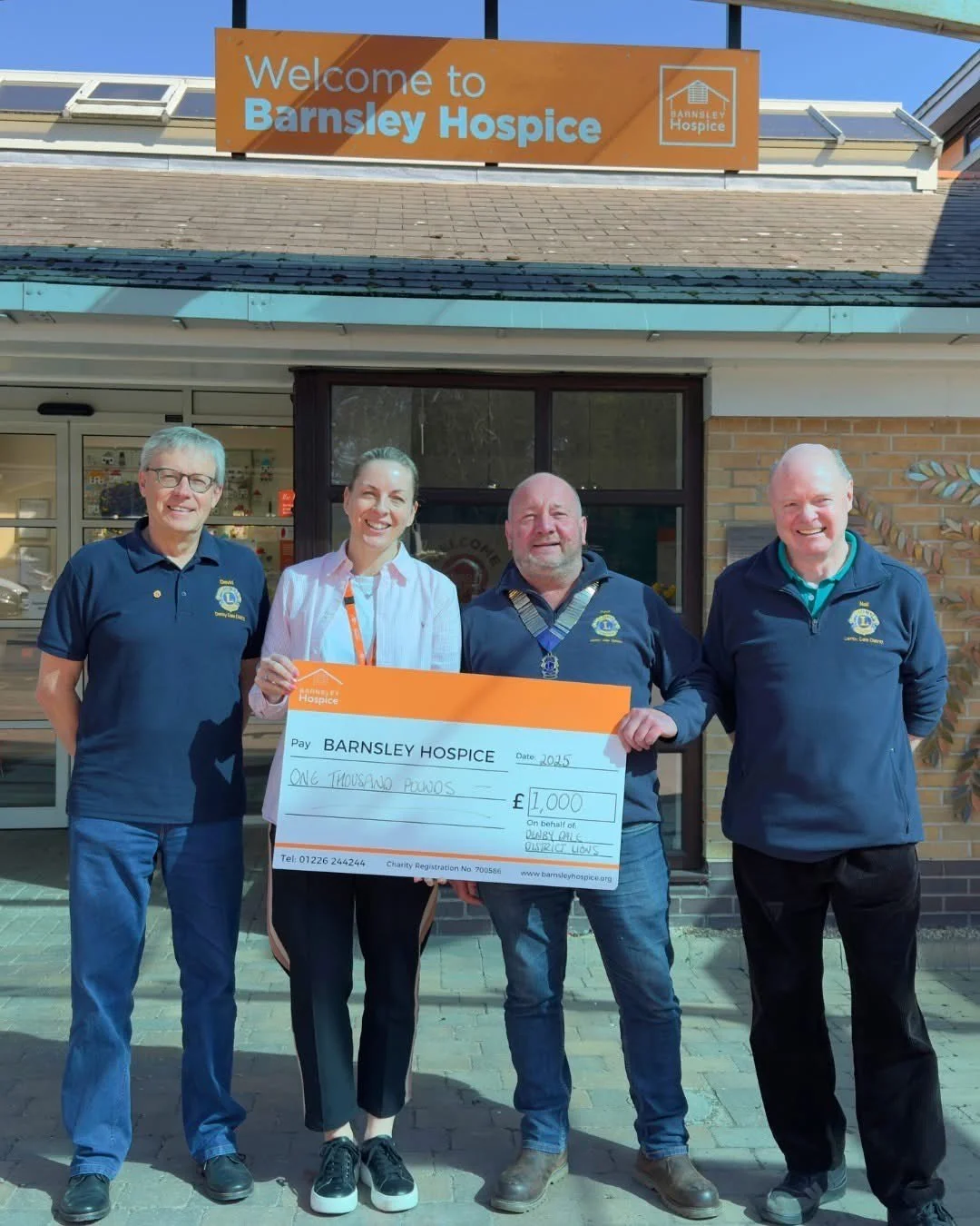 Four people standing in front of Barnsley Hospice holding a large check for one thousand pounds, smiling. The sign above reads 'Welcome to Barnsley Hospice.'