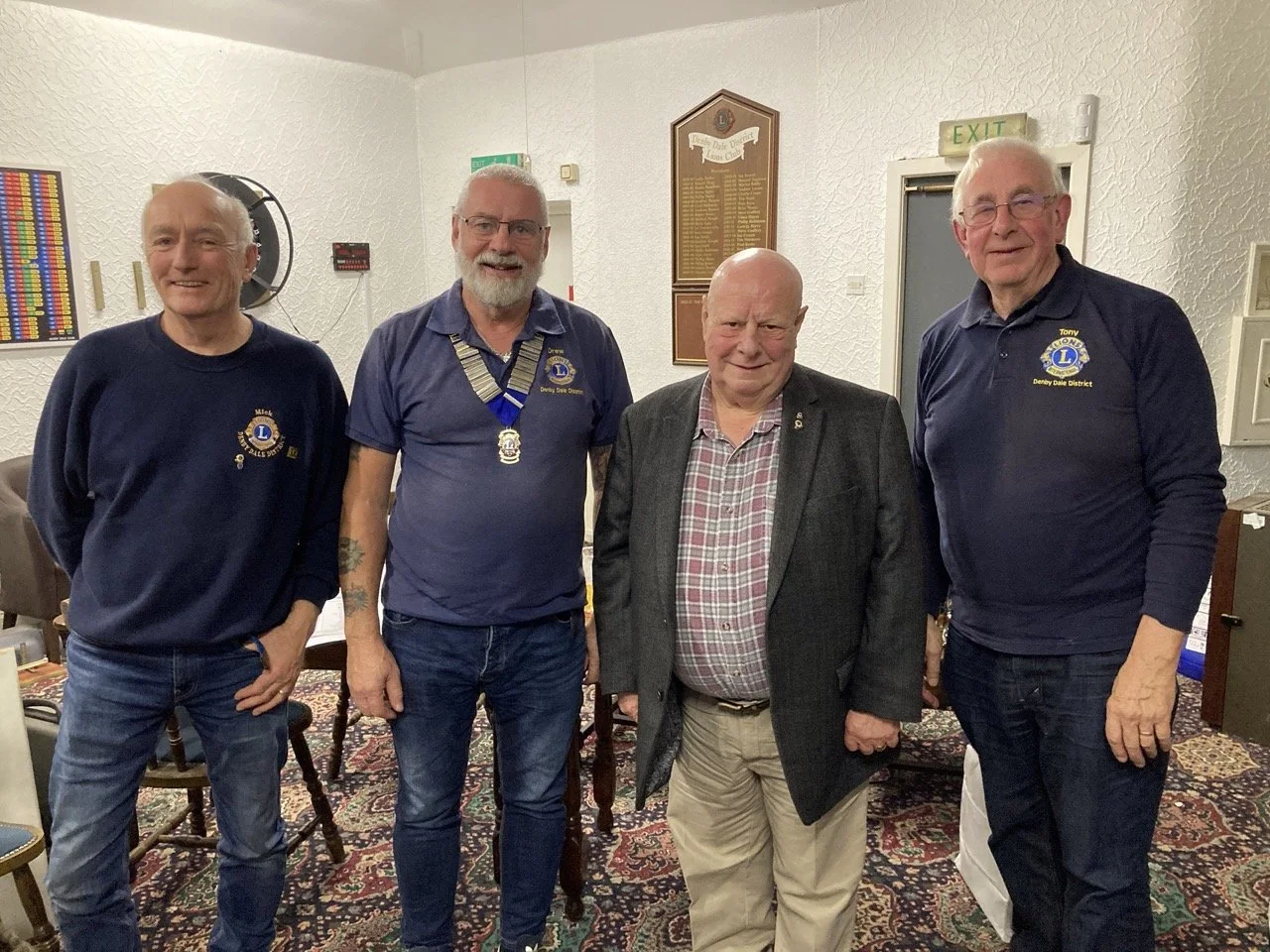 Four older men standing together indoors at a social gathering, smiling at the camera, with two wearing Lions Club shirts and medals.