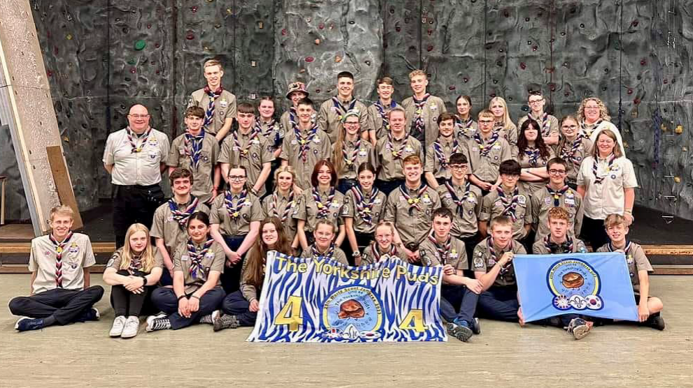 A large group of young Boy Scouts in uniform, along with their adult leaders, pose for a group photo indoors in front of a rock climbing wall. They are holding a banner that reads 'The Yorkshire Puds 404' with an image of a pudding or cupcake, and a